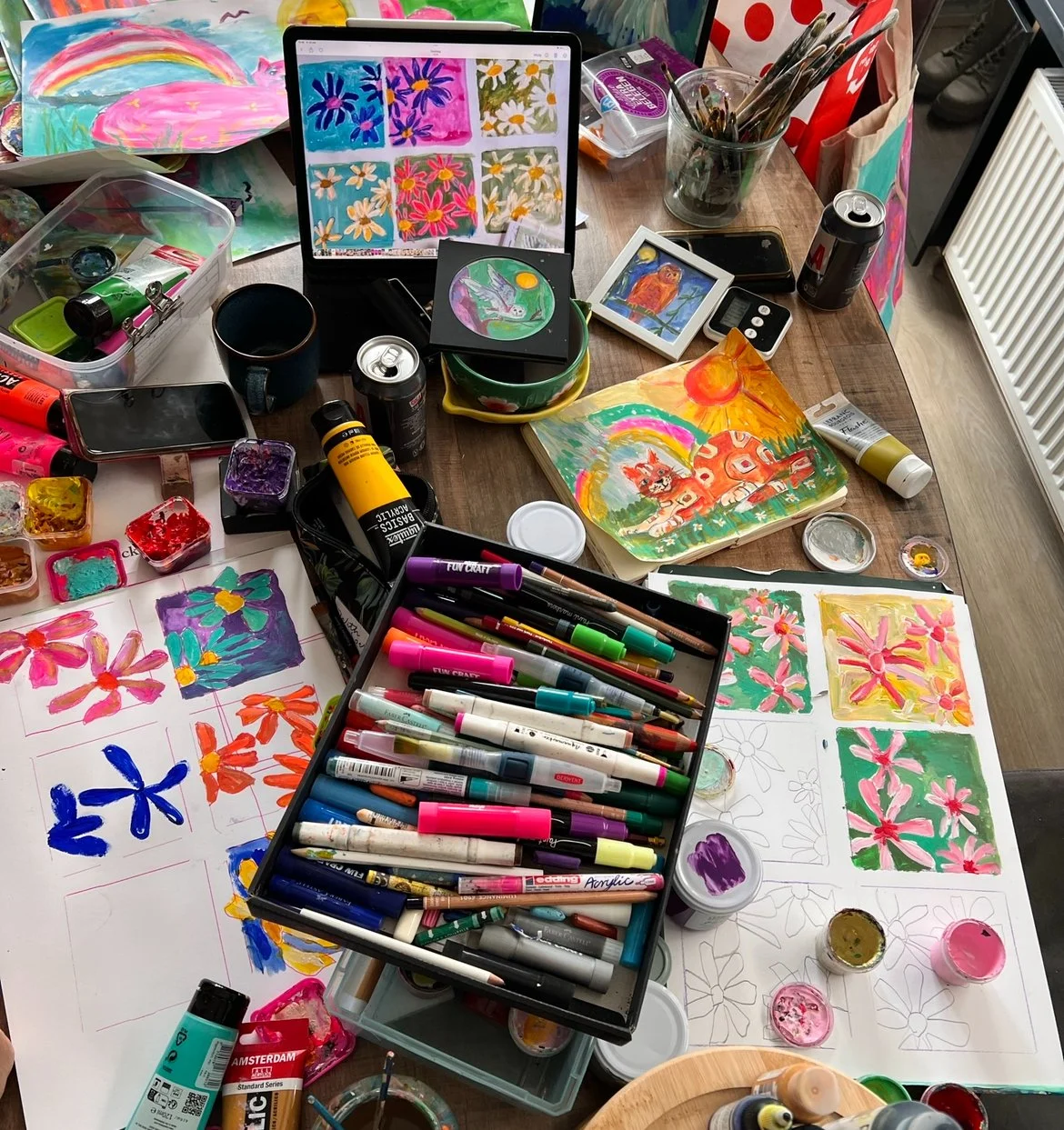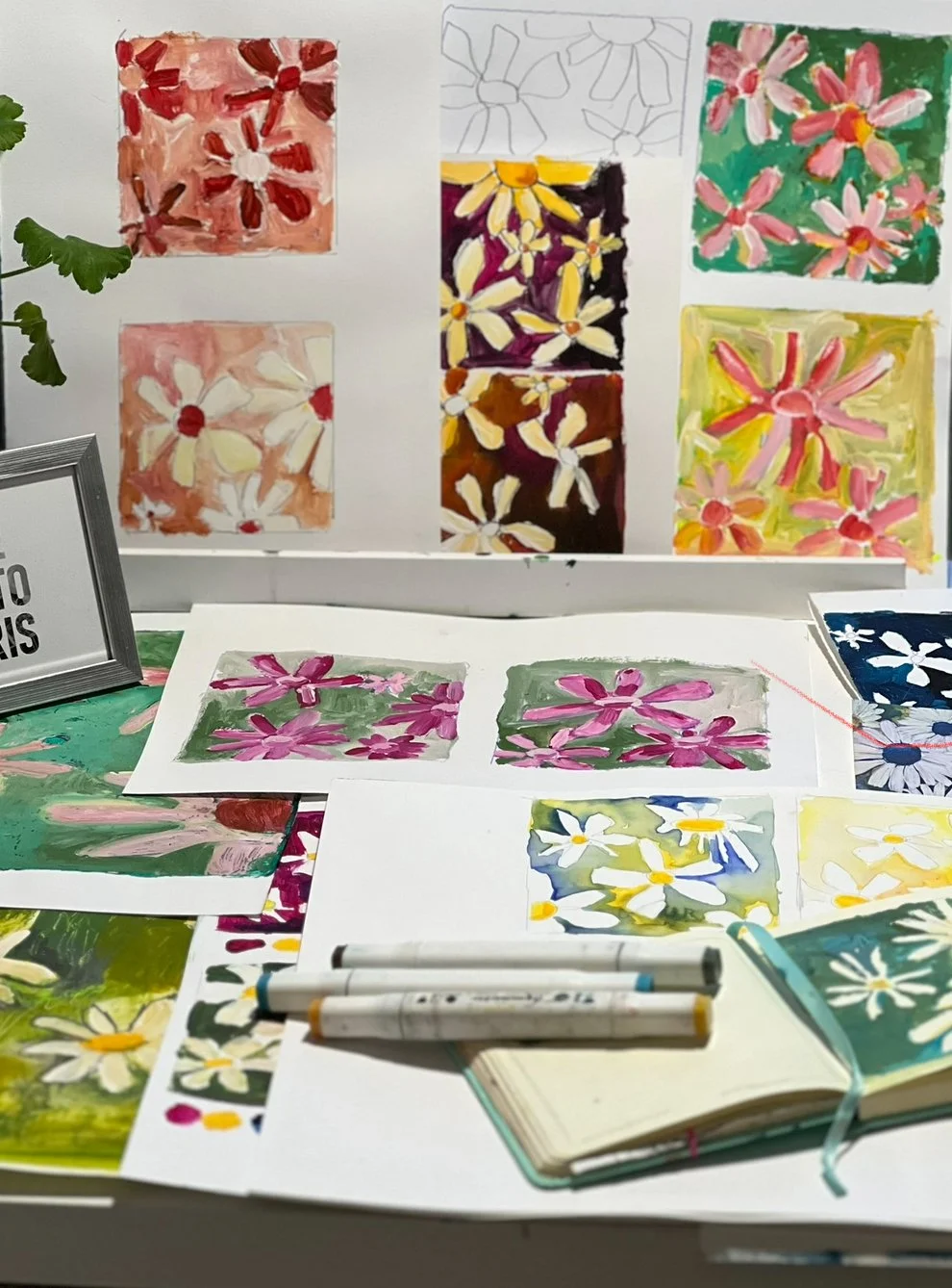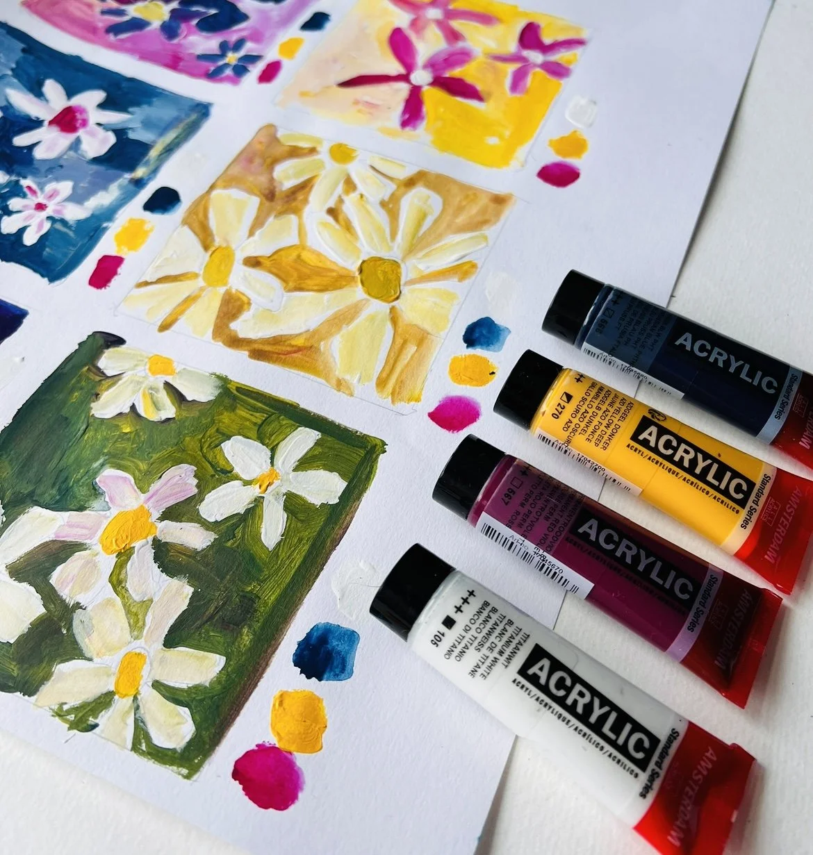 We beginnen met simpele ontspanningsoefeningen om je hoofd leeg te maken. Daarna gaan we losjes aan de slag met het tekenen en schilderen van madeliefjes – zonder regels, zonder oordeel.